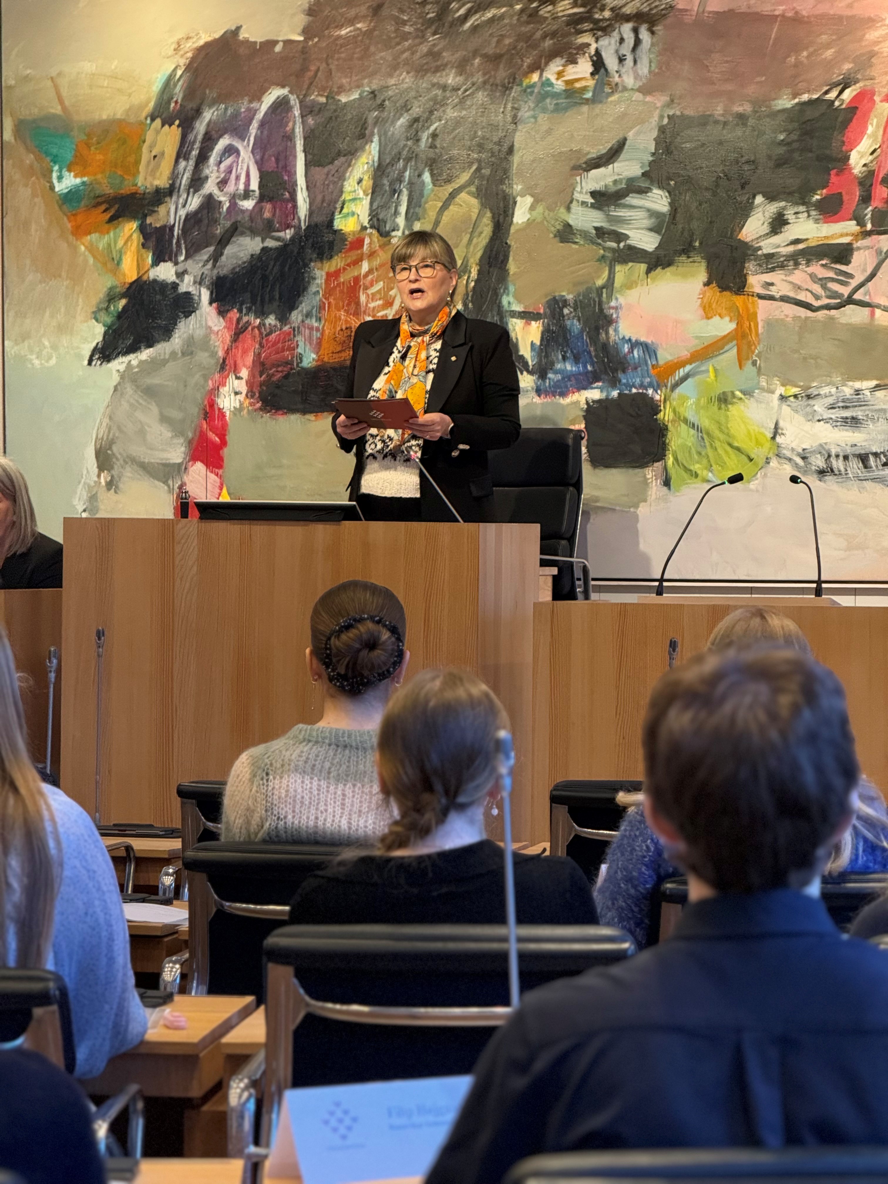Eg fari at bjóða tykkum øllum hjartaliga vælkomnum – tykkum ungu, sum eru næmingar í fólkaskúlanum, og lærarum tykkara. Hesaferð luttaka næmingar úr Sandoyar meginskúla, Runavíkar kommunuskúla, Skúlanum á Skúlatrøð, Tvøroyrar skúla, Skúlanum á Fløtum, Skúlanum á Løgmannabreyt og Sørvágs skúla. Tit eru 10 flokkar, úr sjey skúlum, úr seks økjum í landinum, sum nú manna tingsessirnar við til samans 32 ungdómstingpolitikarum.